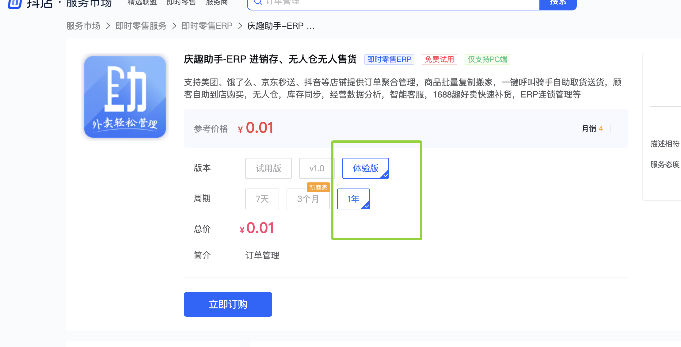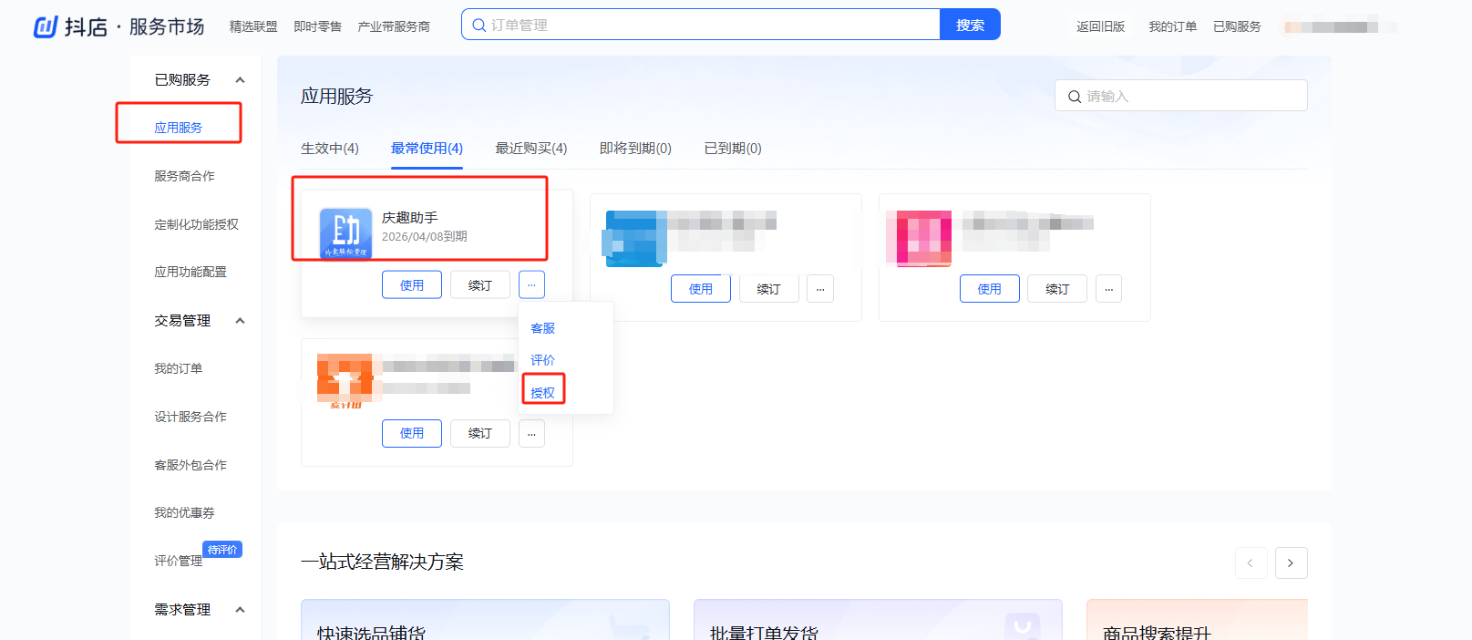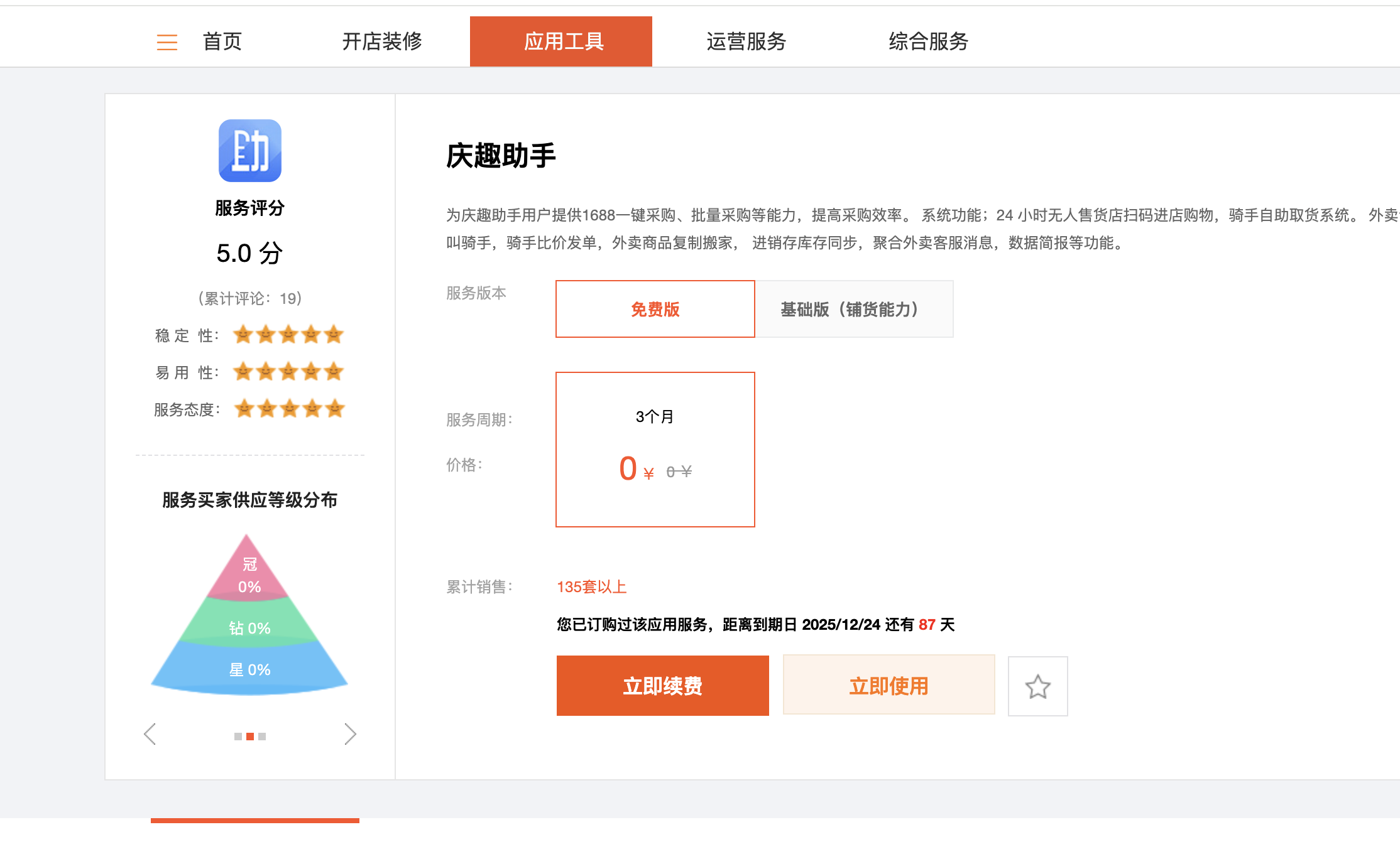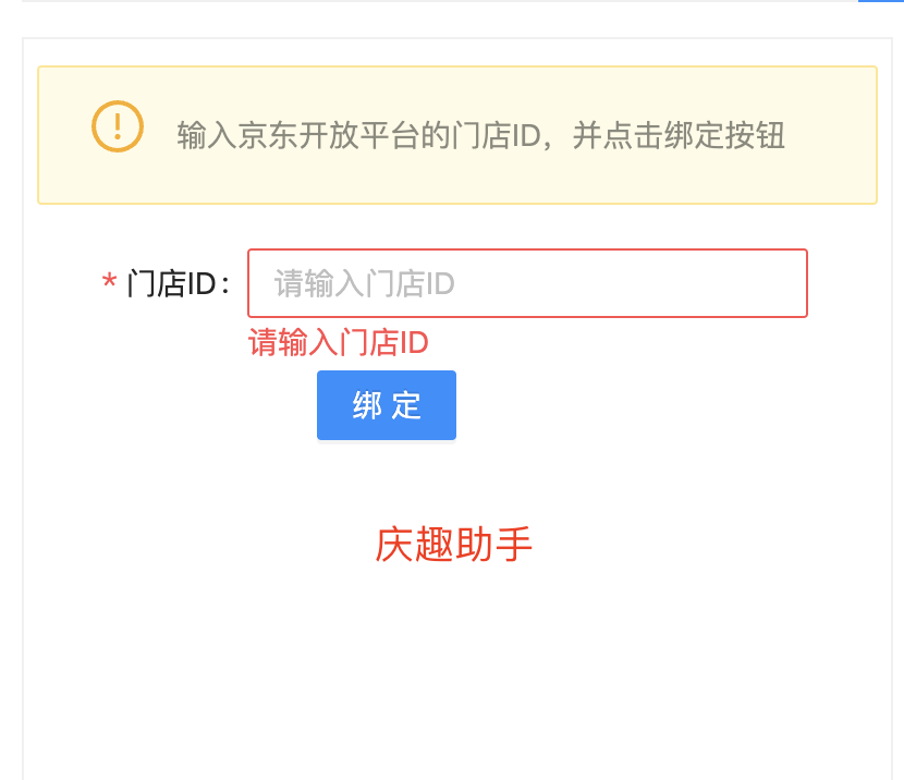 如需管理三方店铺的订单等信息,需要进行店铺绑定,目前支持美**团闪购,饿了么零售,饿了么餐饮,京东秒送,抖店,抖音小时达,拼多多,庆趣宝盒(酒店盒子),庆趣店铺(默认绑定),1688 买家账号**(只用于对接 1688一键补货功能)。 点击运营,进入店铺绑定绑定按钮,可绑定美团零售(餐饮暂不支持)、饿了么零售、饿了么餐饮、京东到家、抖店、抖音小时达,拼多多、庆趣宝盒(酒店盒子) **如不需要庆趣助手自身店铺经营(庆趣助手线上店铺及线下扫码购买场景),则无需申请庆趣助手店铺。未开通庆趣助手店铺不影响绑定并管理三方店铺(美团、饿了么、抖店、京东秒送、拼多多等)不影响使用庆趣助手其他功能。** **注意;** **一,绑定三方店铺之前,请先确认三方店铺已经解除与其他软件平台的绑定,之后才能绑定到庆趣助手。** **二,关于拼多多、抖店、抖音小时达、1688(一件代发绑定)这些平台的账号绑定之前,需要在这些平台的商家服务市场购买庆趣助手服务后才可绑定到庆趣助手上,商家可以先在这些平台上购买免费试用版确认满足功能需求后,再按年或按季度付费购买。在这些平台上购买的消费金额,可以联系在线客服或销售经理全额抵扣购买庆趣助手任意服务金额。**  # 美团店铺新增绑定 ①点此处进入美团闪购开放平台。 输入美团店铺绑定的手机号进行登录  查看关联的商家账号是否正确,确认登录。  复制门店ID,勾选后,授权绑定,**如已绑定其他三方平台应用需先解除绑定,才能绑定庆趣助手 **  勾选,确认绑定,  绑定后返回助手APP 美团绑定页面,输入美团店铺ID,绑定即可使用,同步订单数据及在线消息   # 饿了么店铺新增绑定 ①点此处进入饿了么闪购开放平台。  输入账号密码或手机号登录,品牌店可使用品牌连锁账号登录。  登录后核对店铺名称ID,提交绑定   复制饿了么店铺名称,点击绑定即可使用,可同步订单信息及在线消息。   # 京东到家(秒送)授权步骤 ### 请在京东秒送店铺网页端填写商家编号 登录京东秒送商家后台登录网址 [https://store.jddj.com/](https://store.jddj.com/)   编号可以自定义填写, 如未填写则不能绑定成功。  ### 向庆趣助手客服反馈商家 ID 登录开放平台 https://opendj.jd.com/staticnew/widgets/sellerlogin.jsp 选择商家登录找到应用 ID  一般为 6 位左右的纯数字,将 ID 数字发送给庆趣助手客服。 ### 操作同意应用授权 庆趣助手客服收到商家的门店 ID 后会申请商家授权,然后通知商家,商家使用商家账号登录,在【开放平台 https://opendj.jd.com/staticnew/widgets/sellerlogin.jsp 商家登录】点击待授权按钮,完成授权!!  授权后,请告知庆趣客服已经授权完毕,然后庆趣客服操作**确认授权(庆趣助手增加商户应用)。** ### 在庆趣助手完成绑定 庆趣客服操作确认授权,授权完成后,**告知商家**,然后商家需回到庆趣助手输入门店 ID编号 完成庆趣助手与京东到家店铺的绑定。  确认授权商家账号授权完成后,需等待10分钟,打开庆趣商家后台或者庆趣助手APP输入京东门店编码进行绑定,绑定成功后可正常接单 # 抖店、抖音小时达店铺授权流程 1、访问进行订购 https://fuwu.jinritemai.com/detail?service_id=34069&from=isv.detail 2、可以先订购免费体验版本,可用稳定后再觉得是否购买长期版本。 下面是在抖音平台订购截图,如果是按年直接购买 0.1 元体验版即可,功能和其他版本无区别。因为平台限制免费版最多只能购买 3 个月。  3、订购成功后,进入抖店-已购服务中查看应用【庆趣助手】是否已授权  4、打开庆趣助手APP,进入店铺绑定页面 选择抖音小时达【新增绑定】,输入抖音小时达店铺ID 提交即可 5、如绑定失败,回到抖店服务市场,已购服务中 将【庆趣助手】取消授权,重新授权后重复第3步骤 # 拼多多店铺授权绑定 1、访问进行订购https://fuwu.pinduoduo.com/service-market/service-detail?detailId=89377 2、可先订购免费 15 天的体验版,稳定运行后再订购按年版本。新人按年购买可以领 6 折券订购。 **关于拼多多平台的账号绑定之前,需要在这些平台的商家服务市场购买庆趣助手服务后才可绑定到庆趣助手上,商家可以先在这些平台上购买免费试用版确认满足功能需求后,再按年或按季度付费购买。在这些平台上购买的消费金额,可以联系在线客服或销售经理全额抵扣购买庆趣助手任意服务金额。** 3、订购成功后,打开庆趣助手APP,进入店铺绑定页面 选择拼多多【新增绑定】,输入拼多多门店ID 提交即可  # 1688 店铺绑定 1,庆趣助手绑定 1688 店铺,主要用于商户一键快速补货功能,商户可以在智能“补货建议一键补货”应用内进行绑定操作。绑定 1688 买家账号后,可以实现根据庆趣助手补货建议或缺货预计进行快速批量一键下单补货。详细可以查看[一键补货建议](https://ershou.eqingqu.com/knowbase/document/578.html)功能介绍。 **商家可以先下面平台上购买免费试用版确认满足功能需求后,再按年或按季度付费购买。在平台上购买的消费金额,可以联系在线客服或销售经理全额抵扣购买庆趣助手任意服务金额。相当于 0 元购买** 2,绑定到助手之前,需要先在 1688 服务市场订购庆趣助手应用后才能进行绑定成功。 1688 服务市场订购链接:https://pc.1688.com/product/detail.htm?spm=a26370.30144611.2257390670.1.734b7a32G88xge&productCode=1JqvkB2eear%2F%2Fx7meIa1g3sN%2FpO%2BPQ%2BfmbMxCTZ7u%2FU%3D&productType=GROUP&keywords=%E5%BA%86%E8%B6%A3%E5%8A%A9%E6%89%8B  3,