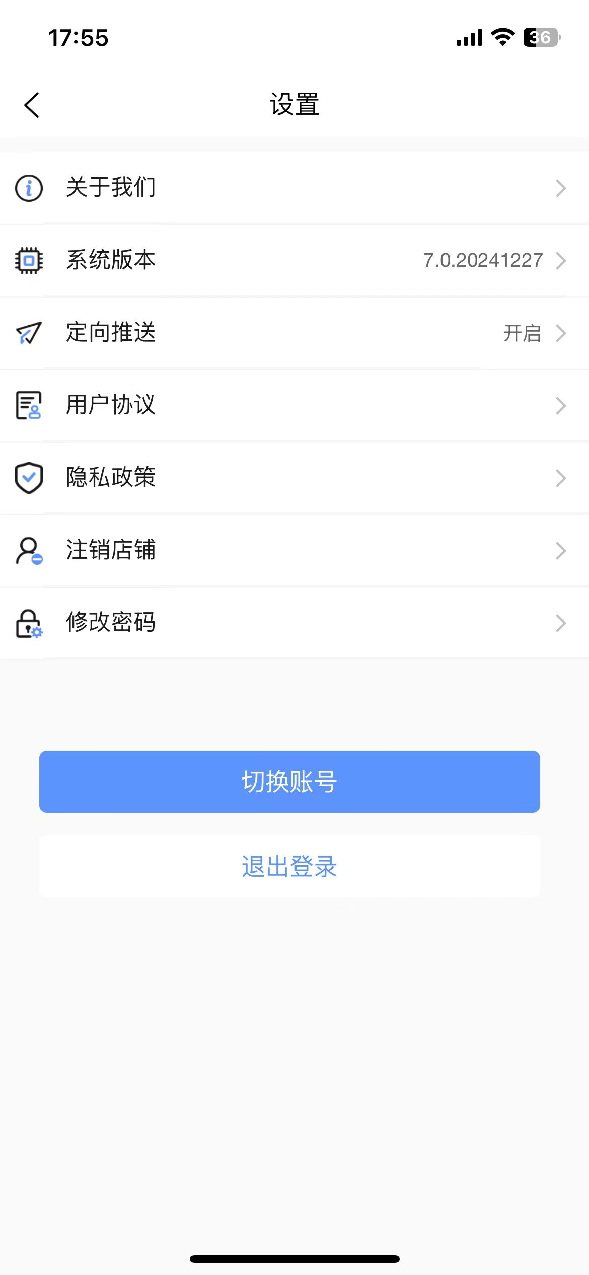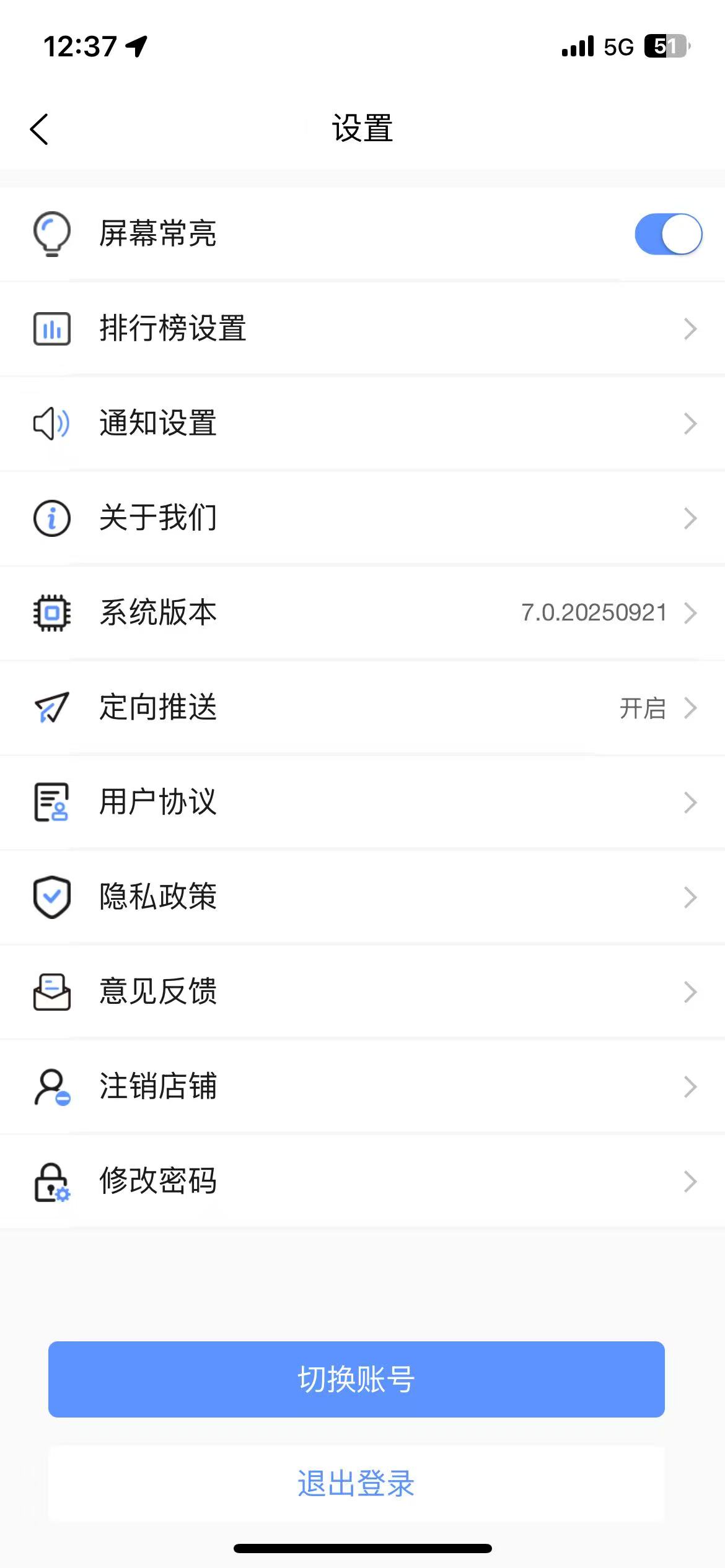 设置内可以查看系统版本,用户协议,隐私政策。可以设置屏幕常亮(仅部分手机机型支持),排行榜设置,通知设置。 **屏幕常亮**功能是保持庆趣助手保持前台运行。  **排行榜**可以设置经营排行的权限,个人单量及勋章是否展示,个人主页可见范围,黑名单管理功能。  **通知中心**设置,订单通知,配送通知,应用功能通知,庆趣助手店铺通知,电话通知等相关通知均在此设置。  可以进行庆趣助手的密码修改,庆趣助手的账号注销(店铺注销操作)。 # 多账号管理 如果店主有多个庆趣助手账号管理可以在此处进行多账号切换功能,如果需要连锁账号一个账号管理多个连锁店的庆趣助手功能,可以在应用中心内开通连锁店铺功能,无需切换账号,只需要关联相关庆趣助手的账号即可通过一个连锁账号管理多个庆趣助手账号。