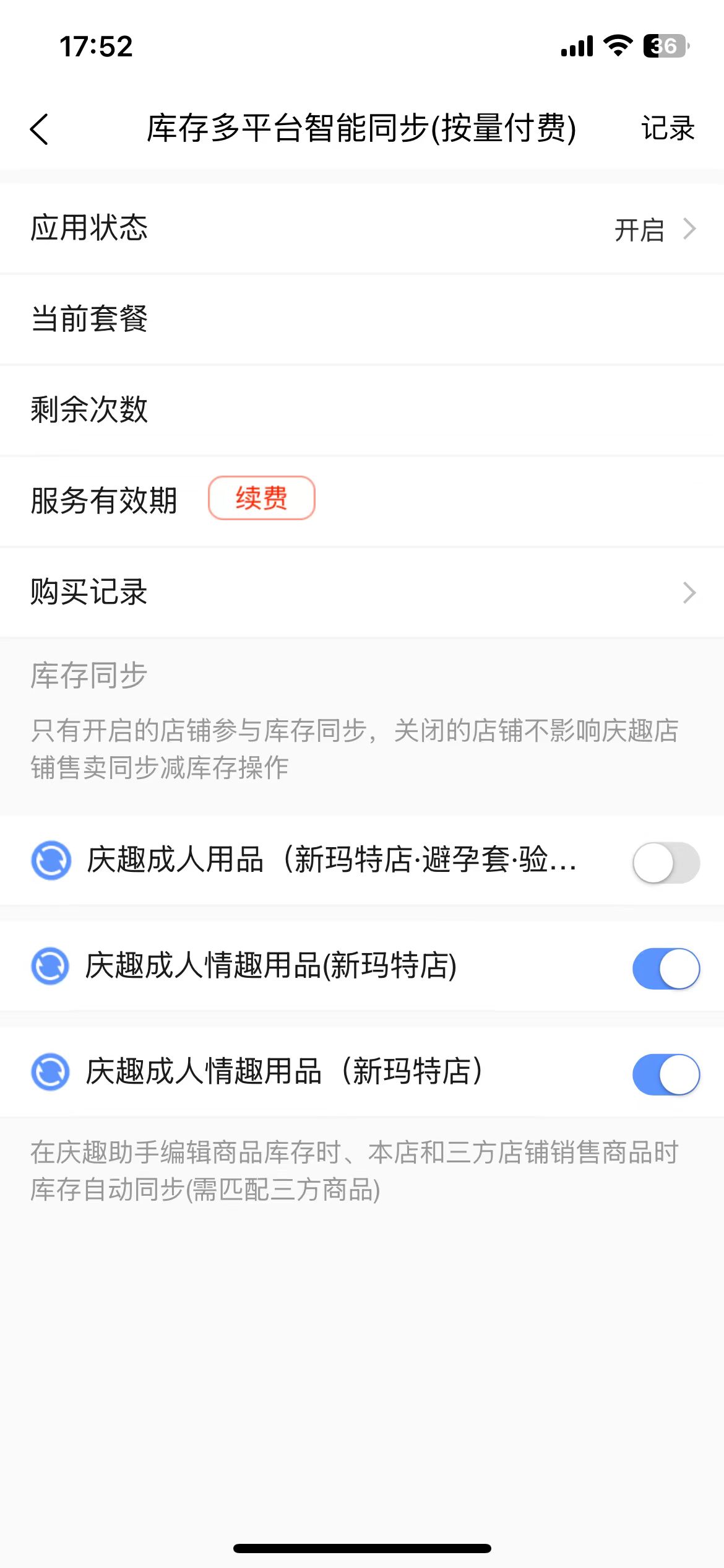 开通此功能前,需要使用“商品数据智能匹配功能”应用把多平台的商品对应关联起来,可实现绑定店铺来订单后库存多平台自动平衡,商品管理编辑库存后自动同步三方平台对应商品,无需来订单后切换到对应平台重复库存修改操作。 目前支持;**庆趣、美团、饿了么、京东秒送、抖音外卖平台**商品一键同步库存,任何一方来单或者在庆趣商品管理编辑一次库存实现自动同步其他平台库存,解放双手。支持记录查询,可点击记录查看使用明细。 注意;需要确定庆趣助手存在这个商品并且和想要同步库存的三方平台商品条形码一致(完成匹配对应关系)才能正常使用此功能。  # 计费方式 每个商品按调用接口次数收费,如1个商品同步到美团和饿了么2个平台,算作2次调用。又如一个订单有2个商品,分别同步到其他2个平台就是2\*2=4次调用。 # 付费方式 按量付费,包年付费两种方式。包年到期后自动变为按量付费,如庆趣助手余额为0则自动关闭按量付费。 按量付费单次调用为0.01元。