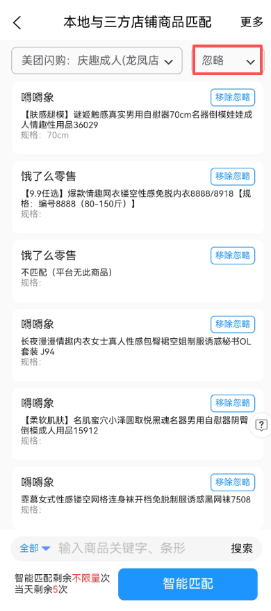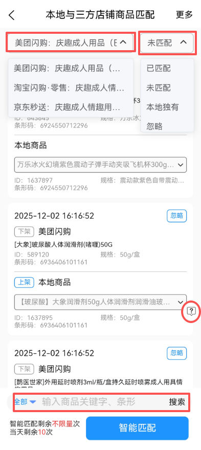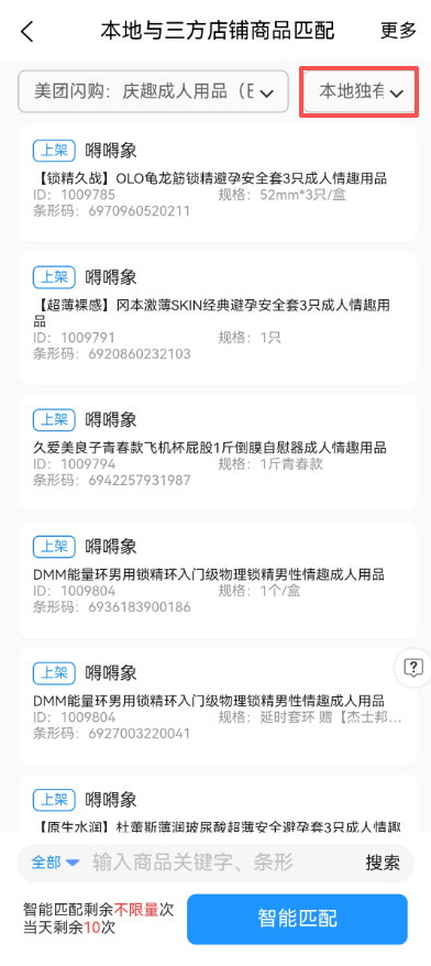 **【商品数据匹配】👇** https://shhai2.oss-cn-shanghai.aliyuncs.com/QINGQU/11-%E5%98%9A%E5%98%9A%E8%B1%A1%E5%95%86%E5%93%81%E6%95%B0%E6%8D%AE%E5%8C%B9%E9%85%8D.mp4 **【商品数据匹配失败如何解决?】👇** https://shhai2.oss-cn-shanghai.aliyuncs.com/QINGQU/12-%E5%98%9A%E5%98%9A%E8%B1%A1%E5%95%86%E5%93%81%E6%95%B0%E6%8D%AE%E5%8C%B9%E9%85%8D%E5%A4%B1%E8%B4%A5%E5%A6%82%E4%BD%95%E8%A7%A3%E5%86%B3%EF%BC%9F.mp4 **【无条形码如何匹配?】👇** https://shhai2.oss-cn-shanghai.aliyuncs.com/QINGQU/13-%E5%98%9A%E5%98%9A%E8%B1%A1%E6%97%A0%E6%9D%A1%E5%BD%A2%E7%A0%81%E5%A6%82%E4%BD%95%E5%8C%B9%E9%85%8D%EF%BC%9F.mp4 如开启库存同步,无人仓骑手取货功能前,必须开启并设置此功能。把嘚嘚象商品和三方商品全部关联后,实现关联关系。 匹配三方商品数据的目的是让嘚嘚象的商品能够对应三方店铺的商品,以此来实现上述功能。比如美团来了一个订单,未做商品匹配情况下助手系统并不清楚这个订单内商品对应的货架号是多少。如已匹配情况下,嘚嘚象的订单信息和骑手取货页面便能够根据嘚嘚象商品信息内维护的货架号进行对应显示。此外,嘚嘚象和三方平台的商品库存同步以及商品上下级状态自动同步都是依靠商品数据匹配的对应关系来实现的。 所以,如果不需要上述功能,可以不做匹配。 # 收费说明 智能匹配功能初次使用赠送 10 次体验,体验次数使用完毕后需要购买。 体验版智能匹配每月总更新限制为 30 次,每天限制使用更新1次。收费版每月可更新限制 60 次,每天限制使用更新 20 次。 手动匹配功能免费。 # 使用教程 商品数据与三方平台商品匹配操作前,确保嘚嘚象的商品条形码与要匹配的三方平台商品条形码(UPC)一致后再操作一键批量智能匹配。如个别商品无法实现条形码一致的情况下,需要在匹配操作内,未匹配的商品下手动操作匹配到庆趣助手。 商品数据智能匹配,必须成功匹配的情况下有效,本地商品连接可以匹配绑定的多个三方店铺,已匹配为系统智能匹配(可同步库存,显示货架号,上下架同步),**系统智能匹配抓取平台对应商品信息upc条形码必须相同,也可手动选择匹配**,首次匹配要选择**全部更新**按钮,每次商品信息有新的变化时选择**未匹配更新**即可,右上角可查看更新记录状态,无问题情况无需重复更新数据。   未匹配状态的商品是在三分平台有此商品,但查本地无此商品。所以未能匹配成功。确保本地和三方平台都有此商品前提下可能的原因有: 1,三方平台的商品规格内条形码和本地商品规格内条形码不对应。解决办法是把三方平台和本地商品的规格条形码对应一致后再操作更新数据。 2,三方平台与本地相同的商品标题和规格名没有一致。解决办法是把三方平台和本地商品标题和规格文字修改一致后再操作更新数据。另外,如不想采用以上两个解决办法,则可以在未匹配里面的每个三方商品上手动操作绑定本地商品即可。  异常数据(嘚嘚象独有商品),未匹配三方店铺的商品,可查看三方店铺是否有此数据,查看商品规格条形码是否相同,修改后选择重新更新数据,选择未匹配更新即可。  忽略链接,在已匹配和未匹配操作忽略链接,操作已忽略的商品,只是不会显示到骑手取货侧的取货信息页面(针对于无人售货店的功能,**例如保密发货等公告链接**),但不影响在用户侧及庆趣助手的订单里显示此商品信息。  **未匹配商品和无条形码如何处理匹配?** 有些商品非标品,没有条形码的情况下则不能智能匹配成功,这些商品或者是维护正确条形码,或者是自己编写一个唯一的条形码(前提是不能被平台识别为其他商品信息,避免商品信息因条形码识别判断而导致显示错乱),最后,也可以在待匹配商品列表内,按商品操作手动选择商品完成匹配操作,此操作则无需条形码完成匹配。 公告链接(例如:保密发货等公告型链接无法匹配)无人仓系统可在【匹配商品里】点【忽略】骑手将看不到 # 商品匹配视频教程 https://images.eqingqu.com/videos/%E5%95%86%E5%93%81%E6%95%B0%E6%8D%AE%E5%8C%B9%E9%85%8D%EF%BC%88%E6%95%99%E7%A8%8B%EF%BC%89.mp4
