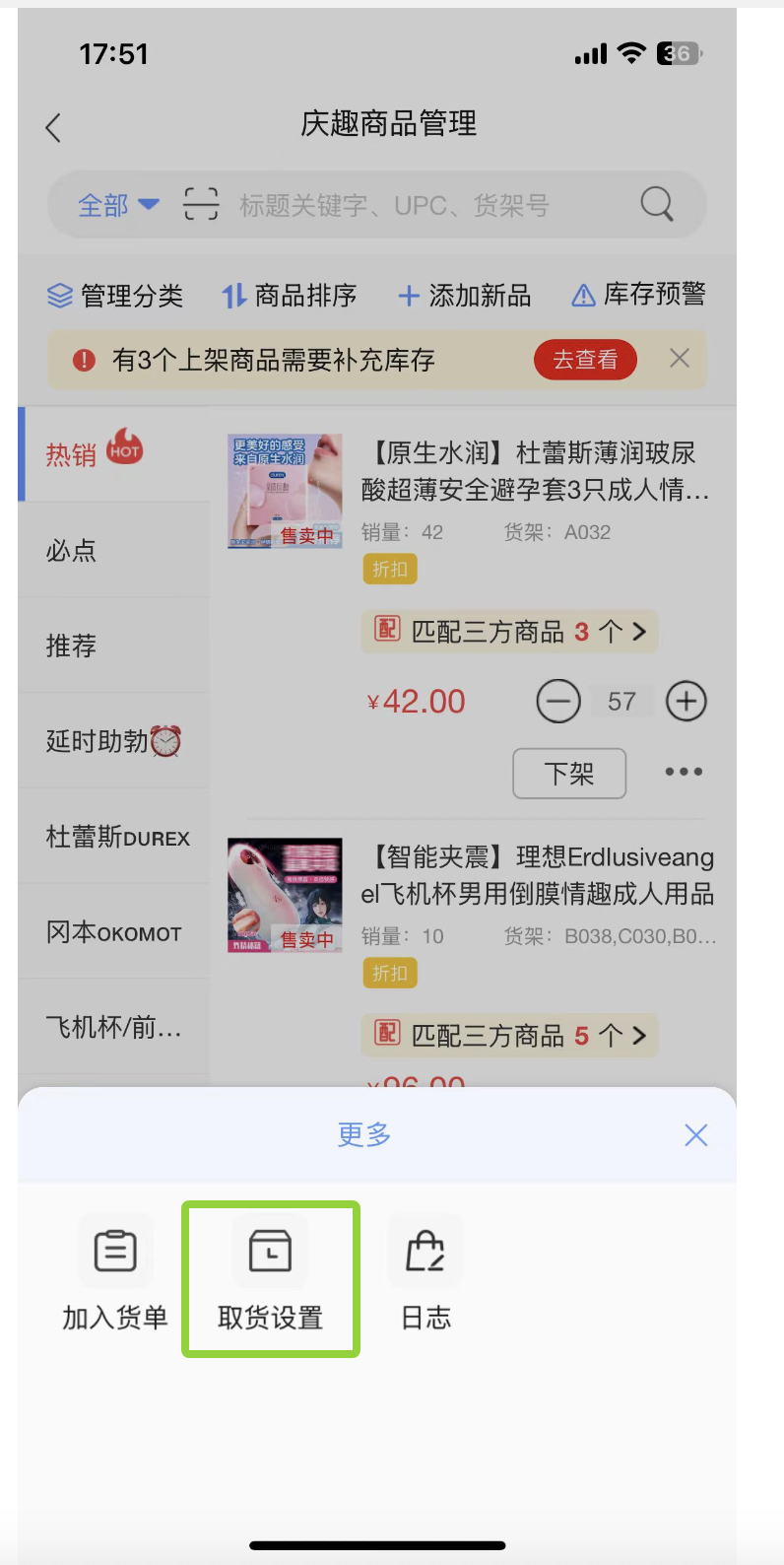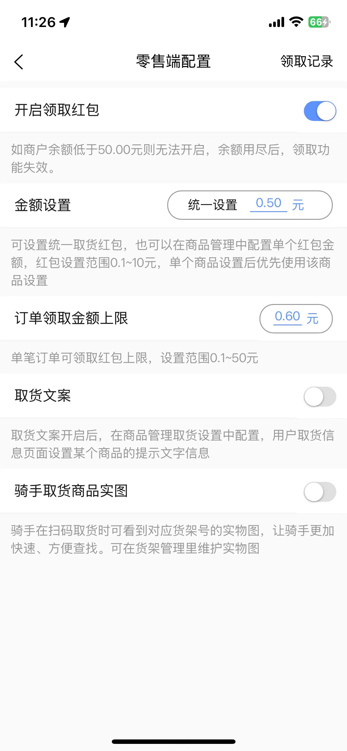 1,可设置骑手取货时的商品拣货红包,可以在**运营-庆趣店铺-商品管理** 下每个商品设置取货红包金额,也可以在这里统一设置,为了资金安全,可以配置单个订单领取红包的最高金额,例如最高金额设置为 5 元,则骑手领取红包时的金额不会超过 5 元。 注:开启此功能需要账号内余额超过50元。单个商品需要超过0.3元设置取货才可生效。   2,可按商品配置骑手取货时候商品下的提示文案。骑手取货时每个商品下可以显示对应店主设置的提示文案。提示文案在**运营-庆趣店铺-商品管理** 下每个商品对应的取货设置中维护提示文案  3,可以设置商品实物图开关,骑手取货时显示商品实物图。实物图在**运营-货架管理**里维护