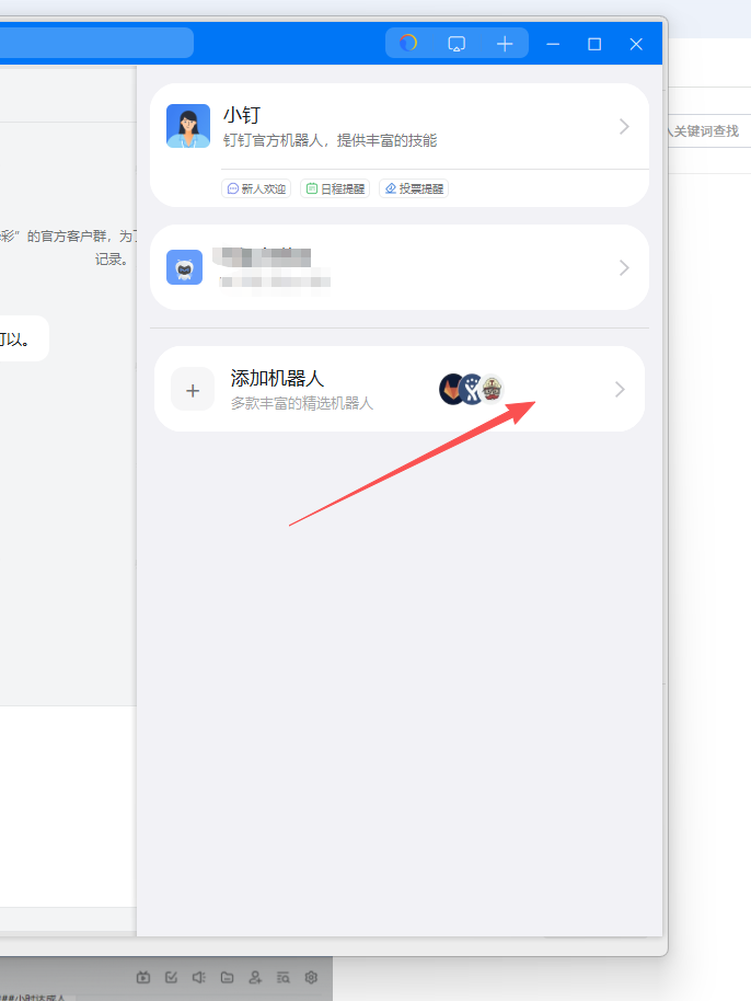 针对于部分商户使用过程中因手机原因经常会出现嘚嘚象系统推送接收不稳定的情况,嘚嘚象推出钉钉群通知功能。 商户下载钉钉 APP 后,新建通知群,并且按下方配置后,可以实现系统消息推送给钉钉,实现钉钉群重复提醒,避免漏掉重要消息造成损失。 # 收费标准 此功能免费 # 使用教程 一、开启钉钉告警开关,选择要接收的消息类型(订单消息、系统消息、IM消息),粘贴钉钉机器人webhook地址 二、如何创建钉钉机器人? 注意;需要有权限的群管理才能创建群机器人。 1、选择一个钉钉群,右上角-群设置    2.选择自定义机器人--点击添加  3.填写您想设置的机器人名字,添加到的群组,安全设置可自行设置,最后点击完成,到这里就已经配置好钉钉机器人了   4.将机器人的webhook复制地址粘贴到庆趣-钉钉告警应用 钉钉机器人栏中,点击提交 保存信息