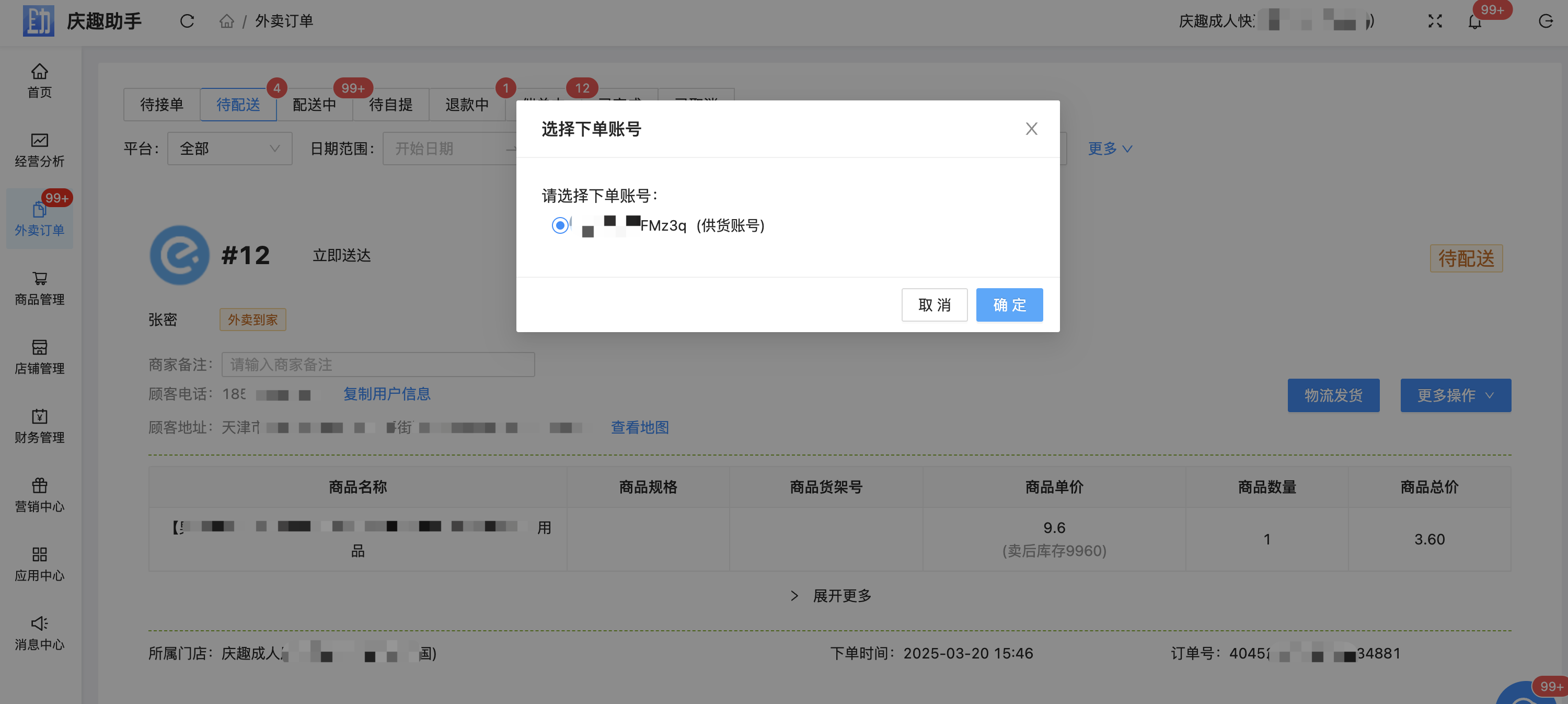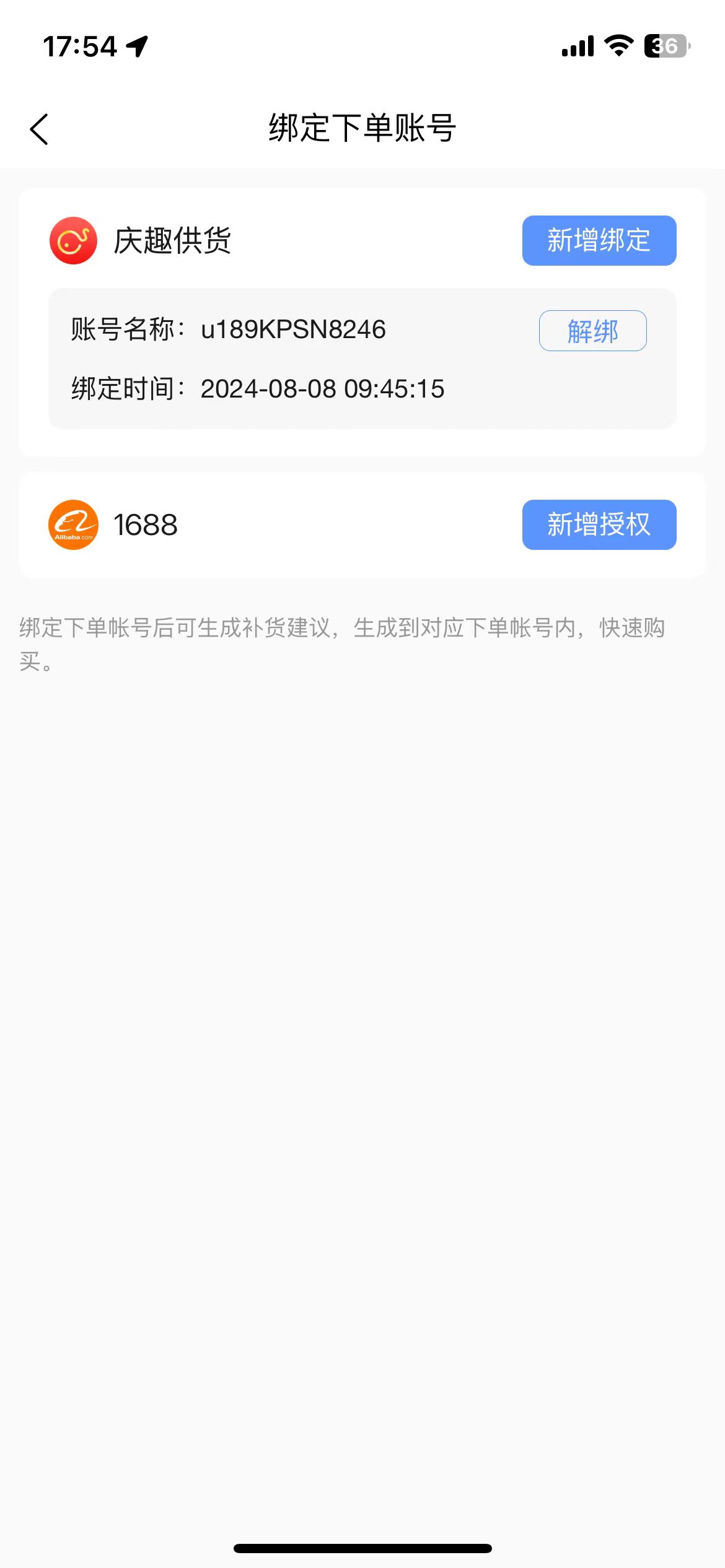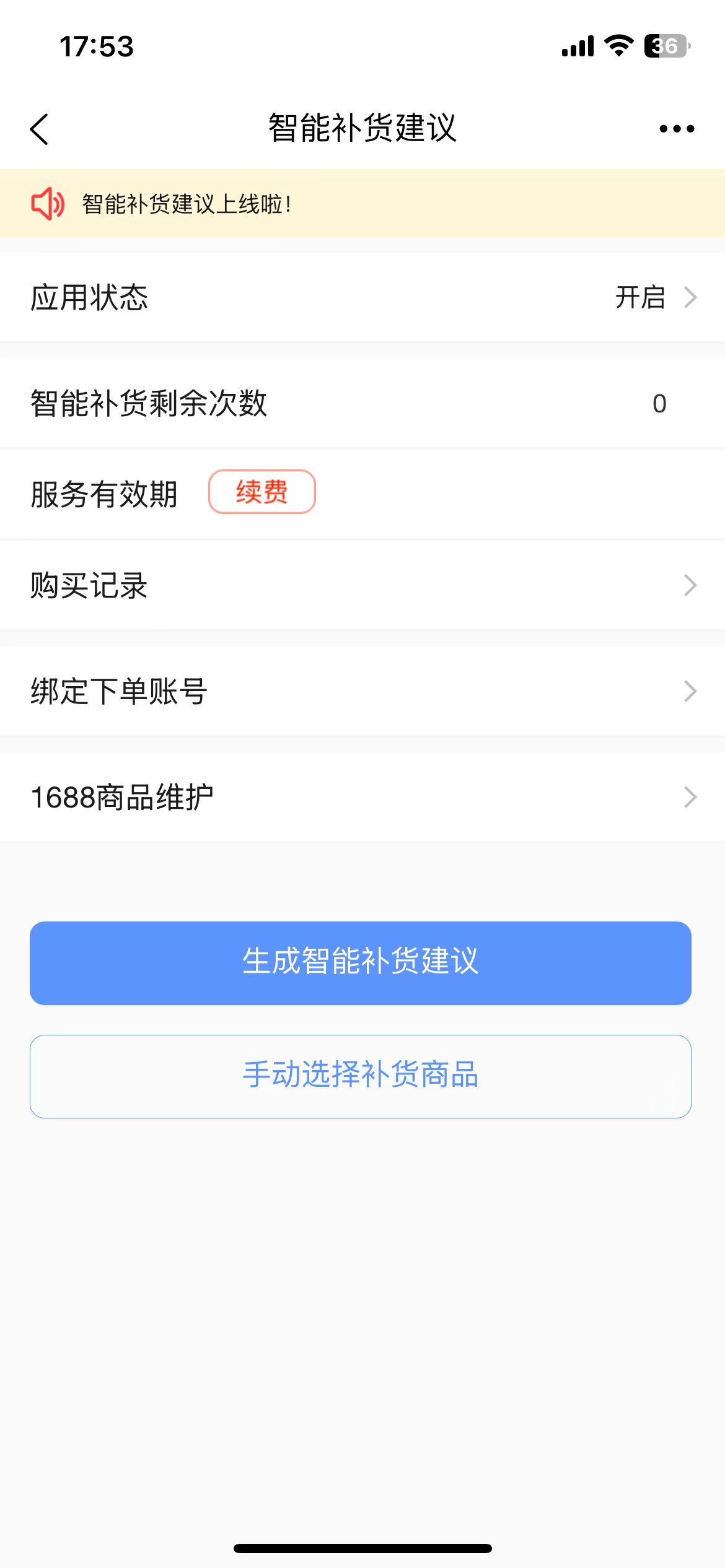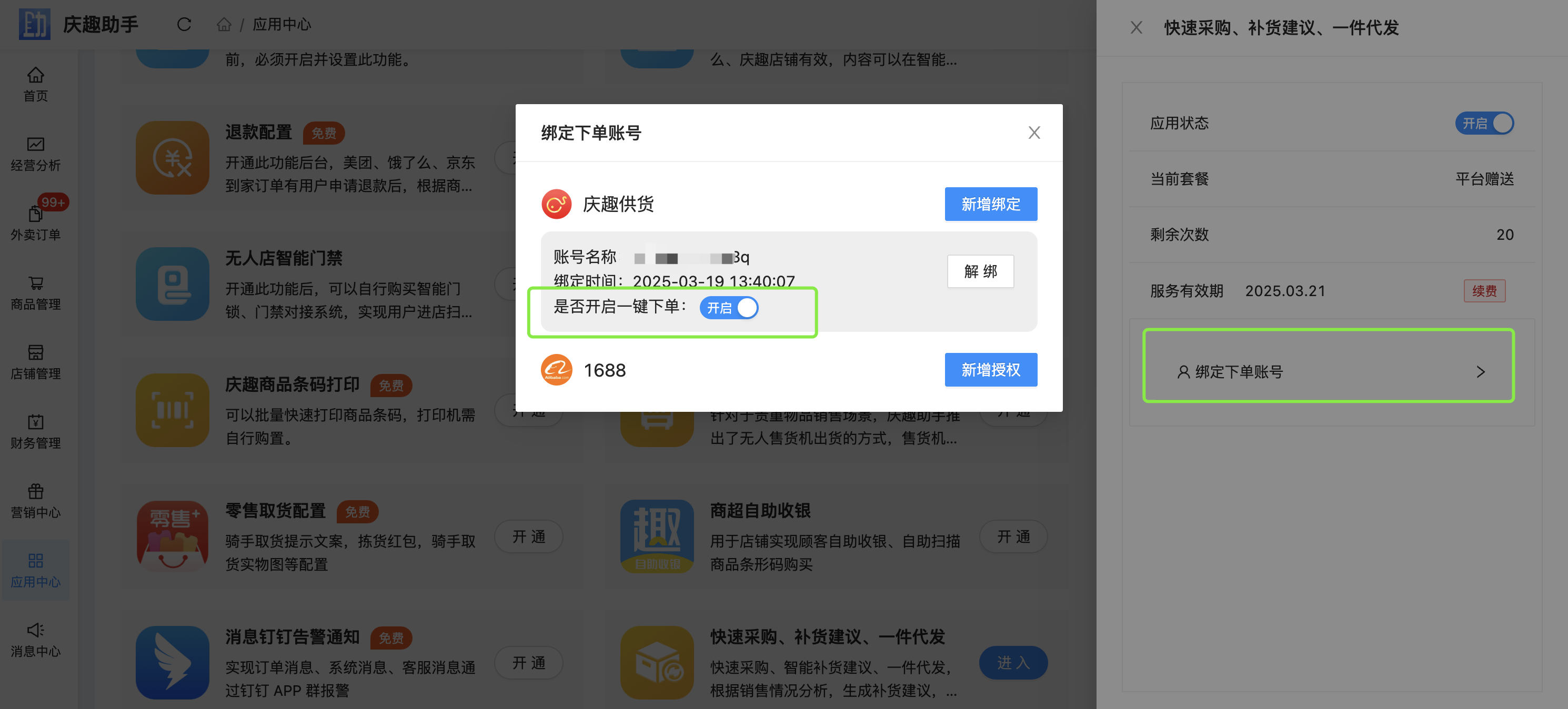很多店主在补货时往往根据自己主观经验来补充,这样的旧方法有可能会导致库存积压,畅销品经常断货而影响商户经营,此方法并非科学有效的补货方法。 庆趣助手智能补货建议是根据店铺的销售情况,包括店铺绑定的线上多个外卖店铺销售情况(需要做数据匹配)来进行生成智能补货建议。如商户想保持30 天的库存,则根据简单的设置即会生成满足整个店铺 30 天销售的商品数量。 此外,还可以绑定三方的趣好卖、1688买家账号,以此实现补货商品一键下单到三方平台的买家账号内,实现一件代发和快速补货。 注意:助手订单上手动操作了一键恢复库存后,订单会被标记为无效,这部分订单不计算入智能补货建议的销售数据内。 # 收费标准 手动补货免费,全平台一键代发功能免费。 智能补货建议按次收费,免费体验 10 次。 # 智能补货建议 智能补货建议是根据**庆趣助手的商品信息及库存为基础**来提出的,所以,如果需要统计除庆趣助手之外的三方店铺数据进行补货建议生成则需要三方平台店铺绑定到庆趣助手,三方店铺的商品需要和庆趣助手本地的商品有一一对应的关系,所以庆趣助手本地需要有售卖商品(不限制上下架状态),售卖商品可以通过[商品搬家](https://help.eqingqu.com/knowbase/document/562.html)功能进行快速生成。以此来实现库存数据的信息的同步,生成包括庆趣助手和三方店铺汇总后的补货建议,商品关系对应功能操作说明详见[商品匹配](https://ershou.eqingqu.com/knowbase/document/565.html)功能。 如果不需要生成包括三方店铺的补货建议,只生成庆趣助手的补货建议,则忽略上面提到的商品数据匹配相关操作,直接操作补货建议生成即可。 也就是说,智能补货建议是以庆趣助手本地商品为依据进行的。 # 快速补货功能 **如果补货到 1688 买家账号**,先绑定 1688 买家账号。在一键补货之前需在助手绑定1688账号页面需操作匹配 1688 商品与助手本地商品进行匹配(只需要匹配需补货的商品,提前维护好,如有新补货商品可以随时再补充操作,每个商品只需要维护一次即可),为的是对应本地商品与 1688 平台商品的对应关系,以此进行快速补货。  **如果补货到趣好卖买家账号**,只需要绑定趣好卖买家账号即可,无需另外进行趣好卖和庆趣助手商品的匹配关系,只要是庆趣助手的订单内商品条形码信息与趣好卖平台商品条形码信息一致即可快速下单补货平台上自动最优价格商品。 **补货操作流程:** 1,绑定 1688/趣好卖下单账号 1688 账号绑定到助手之前,需要先在 1688 服务市场订购庆趣助手应用后才能进行绑定成功。趣好卖账号直接按提示绑定即可。 **商家可以先下面平台上购买免费试用版确认满足功能需求后,再按年或按季度付费购买。在平台上购买的消费金额,可以联系在线客服或销售经理全额抵扣购买庆趣助手任意服务金额。相当于 0 元购买** 1688 服务市场订购链接:https://pc.1688.com/product/detail.htm?spm=a26370.30144611.2257390670.1.734b7a32G88xge&productCode=1JqvkB2eear%2F%2Fx7meIa1g3sN%2FpO%2BPQ%2BfmbMxCTZ7u%2FU%3D&productType=GROUP&keywords=%E5%BA%86%E8%B6%A3%E5%8A%A9%E6%89%8B  订购应用后,回到庆趣助手,在一键补货应用内操作绑定即可。 下图庆趣供货名称在 APP 上已经更新为趣好卖。  2,选择补货商品/根据庆趣助手商品对应的销售数据(包含对应的三方店铺销售数据)自动生成补货建议,首次生成建议之前根据页面提示配置下补货周期相关参数后再点击生成。 根据订单销售情况生成智能补货建议,先要设置智能补货参数  点击生成补货建议  每当需要进行补货的时候,要重新点击右上角生成补货建议。  3,然后根据实际情况选择要补货的商品,加入货单。  4,在货单列表内选择要下单的商品,勾选趣好卖(原庆趣供货)或是 1688 进行下一步结算。  5,加入趣好卖购买账号购物车完成购/支付 1688 下单商品。至此一键补货流程结束。 # 手动补货 除根据智能补货建议外,还支持手动补货支持补货到 1688 和趣好卖两个平台。此功能同样需要庆趣助手本地需要有相应商品信息方可进行(不限制上下架状态)。  点击手动补货  选择需要补货的商品加入货单。然后进行下一步结算操作即可。 # 手动补货视频教程 因软件在不断升级,所以视频画面和新版 APP 效果可能略有不同,只做参考即可。 https://images.eqingqu.com/videos/%E5%BA%86%E8%B6%A3%E5%8A%A9%E6%89%8B%E4%B8%80%E9%94%AE%E8%A1%A5%E8%B4%A7%E6%95%99%E7%A8%8B.mp4 # 多平台一件代发(免费) 目前庆趣助手已经支持庆趣,美团 B2C,饿了么 B2C,拼多多,抖店平台(闲鱼,淘宝,京东后续接入)的订单接入庆趣助手进行一键代发。操作代发后供货商发货单号自动及时回传。**如只单独使用此功能不需要进行本地商品与三方商品的数据匹配操作。** 一件代发功能目前只支持 PC 端操作。zs.eqingqu.com 庆趣助手支持订单一件代发功能,支持庆趣店铺、美团、饿了么、抖音,拼多多类型的**快递类型**店铺订单一件代发。支持通过趣好卖、1688 平台一件代发,下单时支持多个绑定下单账号的灵活选项。 趣好卖代发则不需要特殊配置,代发时会自动对应商品条形码到趣好卖平台价格最优商品,也可以代发操作过程中手动切换代发商品选择。1688 代发则需要按上文提前配置好助手的商品与 1688 商品链接对应匹配才能进行代发操作,未配置助手与 1688 商品对应不影响订单接入。 **一件代发流程;** 庆趣、三方来订单到庆趣助手-订