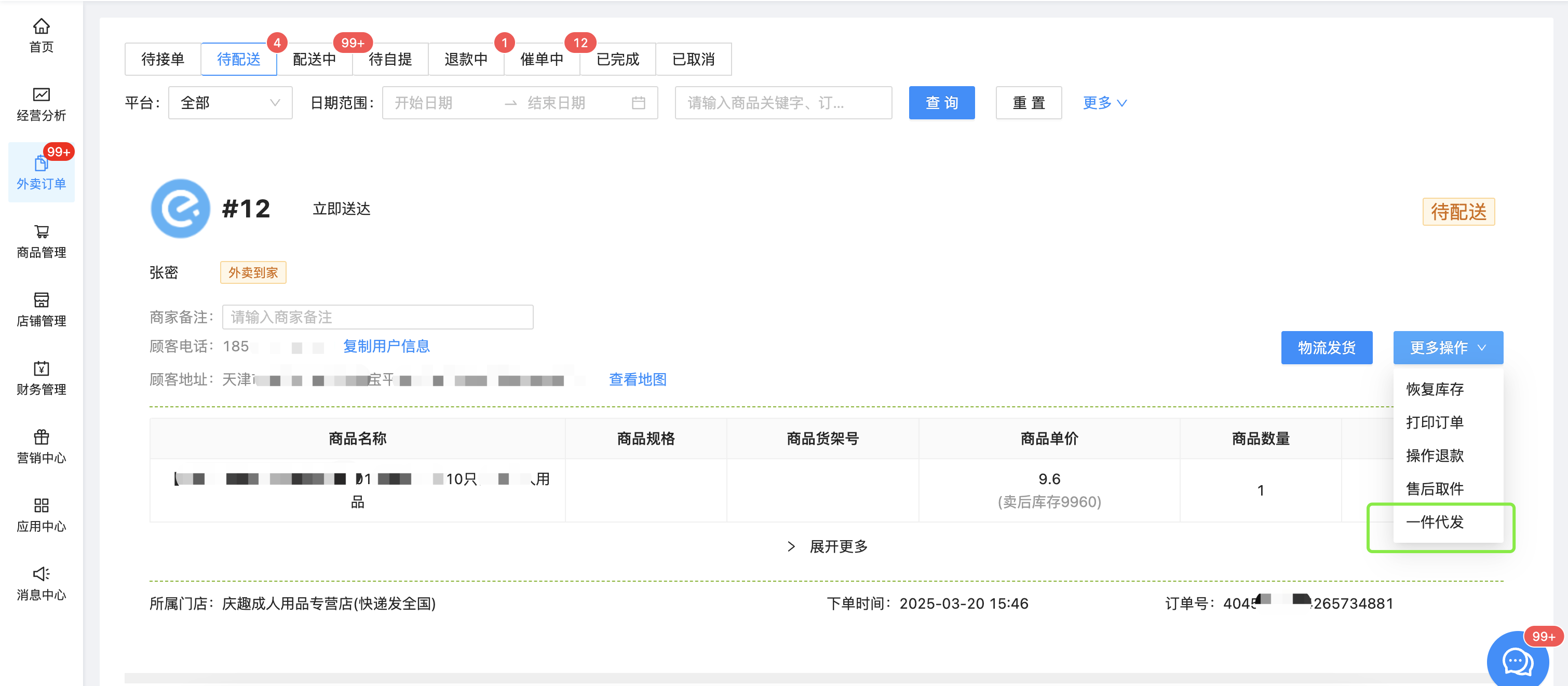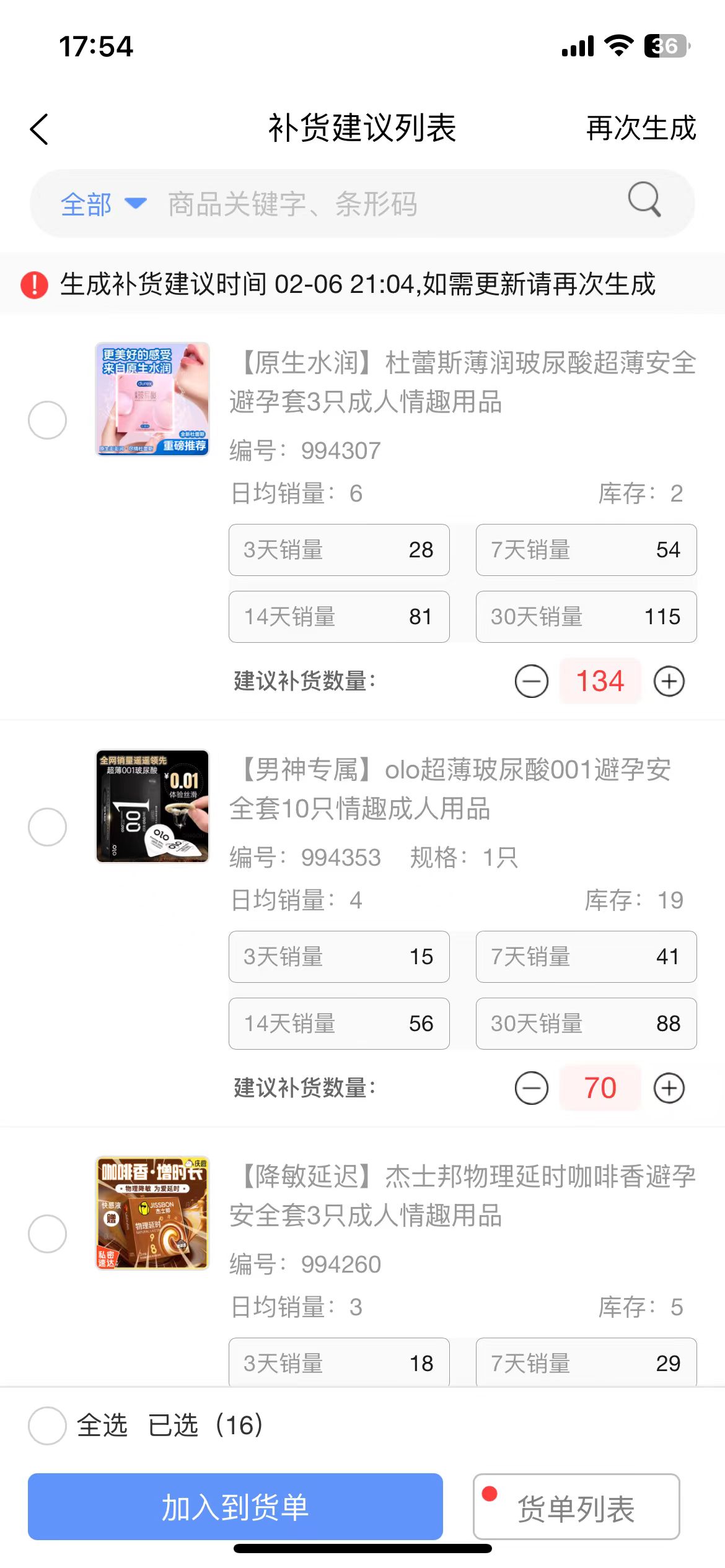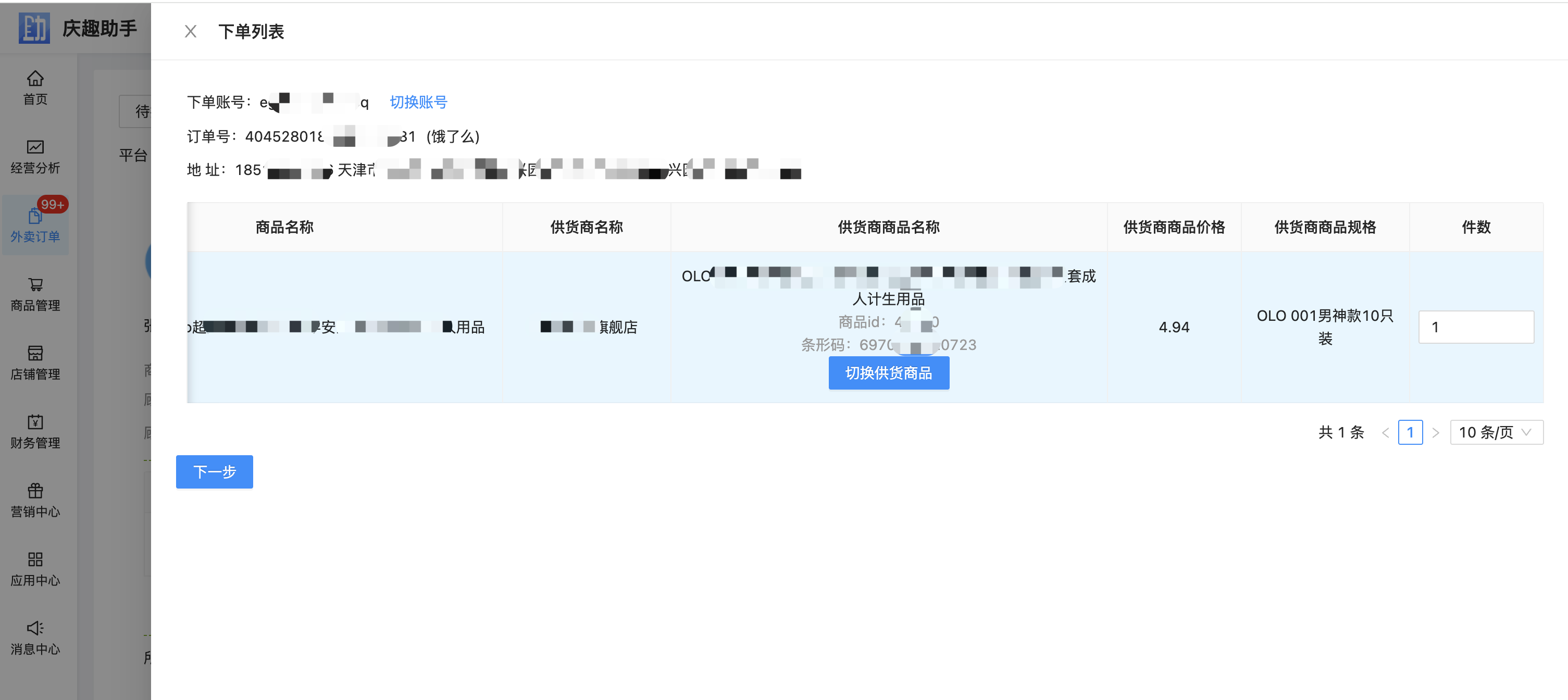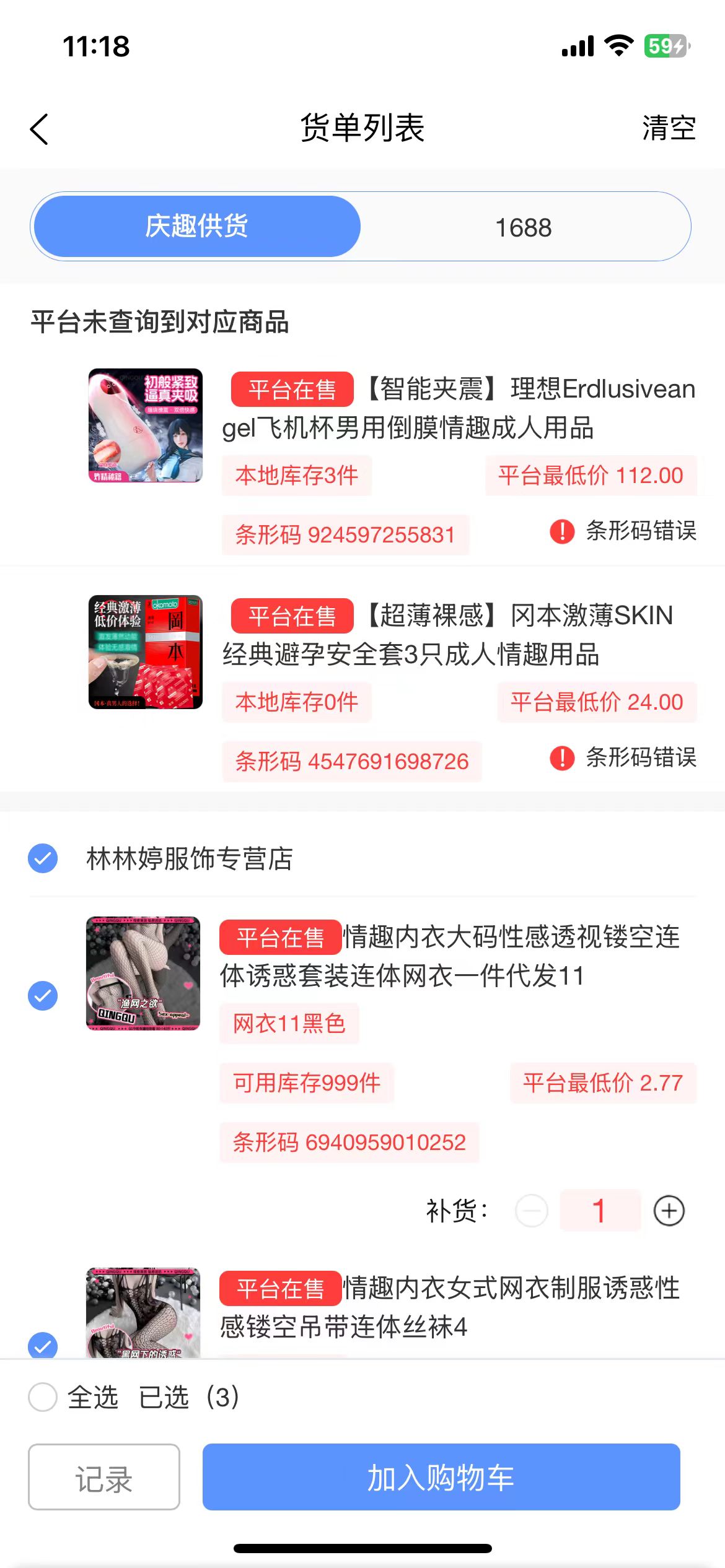 很多店主在补货时往往根据自己主观经验来补充,这样的旧方法有可能会导致库存积压,畅销品经常断货而影响商户经营,此方法并非科学有效的补货方法。 庆趣助手智能补货建议是根据店铺的销售情况,包括店铺绑定的线上多个外卖店铺销售情况(需要做数据匹配)来进行生成智能补货建议。如商户想保持30 天的库存,则根据简单的设置即会生成满足整个店铺 30 天销售的商品数量。 此外,还可以绑定三方的趣好卖、1688买家账号,以此实现补货商品一键下单到三方平台的买家账号内,实现一件代发和快速补货。 注意:助手订单上手动操作了一键恢复库存后,订单会被标记为无效,这部分订单不计算入智能补货建议的销售数据内。 # 收费标准 手动补货免费,全平台一键代发功能免费。 智能补货建议按次收费,免费体验 10 次。 # 智能补货建议 智能补货建议是根据**庆趣助手的商品信息及库存为基础**来提出的,所以,如果需要统计除庆趣助手之外的三方店铺数据进行补货建议生成则需要三方平台店铺绑定到庆趣助手,三方店铺的商品需要和庆趣助手本地的商品有一一对应的关系,所以庆趣助手本地需要有售卖商品(不限制上下架状态),售卖商品可以通过[商品搬家](https://help.eqingqu.com/knowbase/document/562.html)功能进行快速生成。以此来实现库存数据的信息的同步,生成包括庆趣助手和三方店铺汇总后的补货建议,商品关系对应功能操作说明详见[商品匹配](https://ershou.eqingqu.com/knowbase/document/565.html)功能。 如果不需要生成包括三方店铺的补货建议,只生成庆趣助手的补货建议,则忽略上面提到的商品数据匹配相关操作,直接操作补货建议生成即可。 也就是说,智能补货建议是以庆趣助手本地商品为依据进行的。 # 快速补货功能 **如果补货到 1688 买家账号**,先绑定 1688 买家账号。在一键补货之前需在助手绑定1688账号页面需操作匹配 1688 商品与助手本地商品进行匹配(只需要匹配需补货的商品,提前维护好,如有新补货商品可以随时再补充操作,每个商品只需要维护一次即可),为的是对应本地商品与 1688 平台商品的对应关系,以此进行快速补货。  **如果补货到趣好卖买家账号**,只需要绑定趣好卖买家账号即可,无需另外进行趣好卖和庆趣助手商品的匹配关系,只要是庆趣助手的订单内商品条形码信息与趣好卖平台商品条形码信息一致即可快速下单补货平台上自动最优价格商品。 **补货操作流程:** 1,绑定 1688/趣好卖下单账号 1688 账号绑定到助手之前,需要先在 1688 服务市场订购庆趣助手应用后才能进行绑定成功。趣好卖账号直接按提示绑定即可。 **商家可以先下面平台上购买免费试用版确认满足功能需求后,再按年或按季度付费购买。在平台上购买的消费金额,可以联系在线客服或销售经理全额抵扣购买庆趣助手任意服务金额。相当于 0 元购买** 1688 服务市场订购链接:https://pc.1688.com/product/detail.htm?spm=a26370.30144611.2257390670.1.734b7a32G88xge&productCode=1JqvkB2eear%2F%2Fx7meIa1g3sN%2FpO%2BPQ%2BfmbMxCTZ7u%2FU%3D&productType=GROUP&keywords=%E5%BA%86%E8%B6%A3%E5%8A%A9%E6%89%8B  订购应用后,回到庆趣助手,在一键补货应用内操作绑定即可。 下图庆趣供货名称在 APP 上已经更新为趣好卖。  2,选择补货商品/根据庆趣助手商品对应的销售数据(包含对应的三方店铺销售数据)自动生成补货建议,首次生成建议之前根据页面提示配置下补货周期相关参数后再点击生成。 根据订单销售情况生成智能补货建议,先要设置智能补货参数  点击生成补货建议  每当需要进行补货的时候,要重新点击右上角生成补货建议。  3,然后根据实际情况选择要补货的商品,加入货单。  4,在货单列表内选择要下单的商品,勾选趣好卖(原庆趣供货)或是 1688 进行下一步结算。  5,加入趣好卖购买账号购物车完成购/支付 1688 下单商品。至此一键补货流程结束。 # 手动补货 除根据智能补货建议外,还支持手动补货支持补货到 1688 和趣好卖两个平台。此功能同样需要庆趣助手本地需要有相应商品信息方可进行(不限制上下架状态)。  点击手动补货  选择需要补货的商品加入货单。然后进行下一步结算操作即可。 # 手动补货视频教程 因软件在不断升级,所以视频画面和新版 APP 效果可能略有不同,只做参考即可。 https://images.eqingqu.com/videos/%E5%BA%86%E8%B6%A3%E5%8A%A9%E6%89%8B%E4%B8%80%E9%94%AE%E8%A1%A5%E8%B4%A7%E6%95%99%E7%A8%8B.mp4 # 多平台一件代发(免费) 目前庆趣助手已经支持庆趣,美团 B2C,饿了么 B2C,拼多多,抖店平台(闲鱼,淘宝,京东后续接入)的订单接入庆趣助手进行一键代发。操作代发后供货商发货单号自动及时回传。**如只单独使用此功能不需要进行本地商品与三方商品的数据匹配操作。** 一件代发功能目前只支持 PC 端操作。zs.eqingqu.com 庆趣助手支持订单一件代发功能,支持庆趣店铺、美团、饿了么、抖音,拼多多类型的**快递类型**店铺订单一件代发。支持通过趣好卖、1688 平台一件代发,下单时支持多个绑定下单账号的灵活选项。 趣好卖代发则不需要特殊配置,代发时会自动对应商品条形码到趣好卖平台价格最优商品,也可以代发操作过程中手动切换代发商品选择。1688 代发则需要按上文提前配置好助手的商品与 1688 商品链接对应匹配才能进行代发操作,未配置助手与 1688 商品对应不影响订单接入。 **一件代发流程;** 庆趣、三方来订单到庆趣助手-订