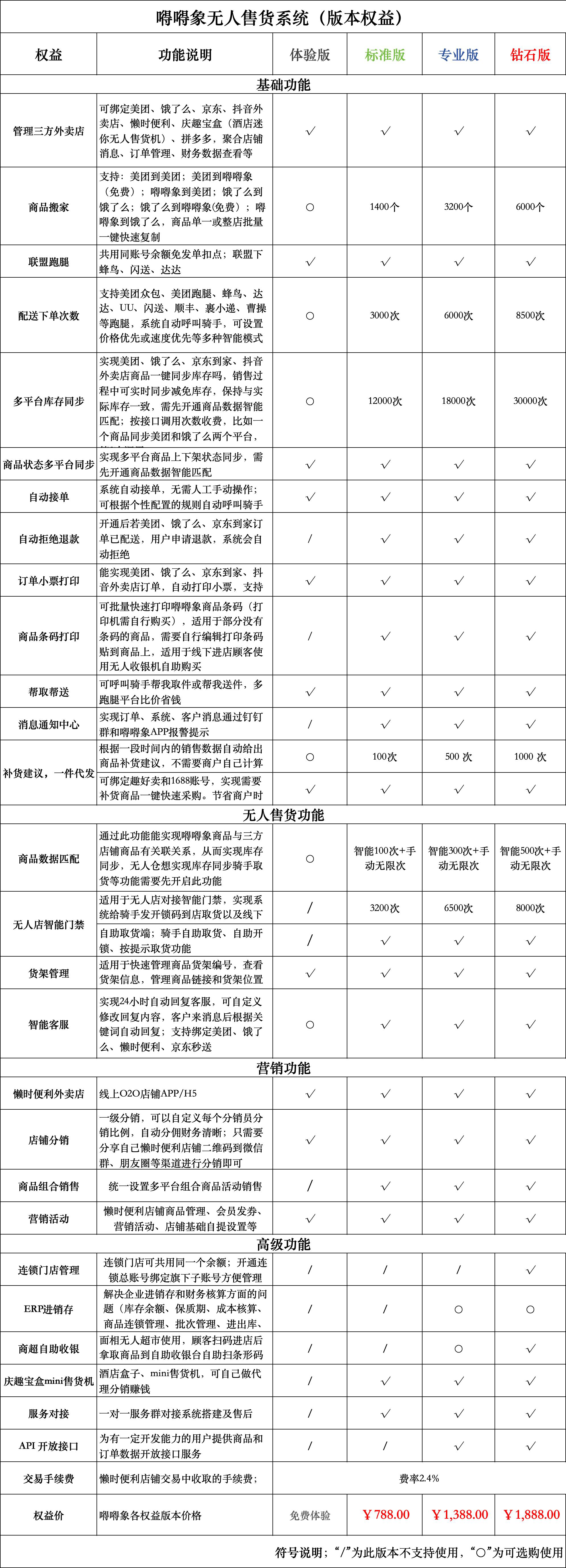 # 🚀 嘚嘚象使用全览(原庆趣助手) > 一文带你了解这款智能零售神器到底能做什么! --- ## 🌟 一、嘚嘚象是什么? 简单说,\*\*嘚嘚象*\*就是一个帮你“轻松管店、自动卖货、智能补货、骑手自助取货送货”的零售管理平台。 它专门为 **无人售货、便利店、成人用品、美妆、零食、百货、宠物店、酒店房间售货盒** 等各种零售场景设计。 一句话总结: > 不管你是开小店、连锁,还是做无人货架、外卖自提,都能靠嘚嘚象一站搞定。 **【嘚嘚象有什么用?】👇** https://shhai2.oss-cn-shanghai.aliyuncs.com/QINGQU/35-%E5%98%9A%E5%98%9A%E8%B1%A1%E6%98%AF%E4%BB%80%E4%B9%88%EF%BC%9F.mp4 从上架商品、接单发货、跑腿配送,到库存同步、智能门禁、自动收银,嘚嘚象都有模块帮你打理。 你可以理解为一个集成了外卖中台 + ERP + 无人门锁 + 补货系统+自助取货的“智能零售操作台”。 ---  --- ## 🧩 二、系统功能总览(一句话版) | 模块 | 功能亮点 | | --------------------- | ---------------------------------------------------------------------------- | | **账号 & 开通** | 注册账号,选择店铺类型,一键开通无人售货模式 | | **订单中心** | 聚合美团、饿了么、抖音、京东秒送、拼多多等多平台订单 | | **商品管理** | 支持商品一键复制搬家、多平台商品条码匹配、多平台库存同步 | | **库存 & 货架** | 库存预警、货架号管理、库存一键恢复 | | **配送 & 跑腿** | 一键开通联盟跑腿或手动开通多个跑腿平台,支持智能下单跑腿规则 | | **用户取货** | 支持扫码验证问题或取货码开门、实名验证、自动识别取货订单指引骑手一键导航送达 | | **应用中心** | 拓展功能插件,比如分销、AI客服、智能门禁、条码打印、自主收银、ERP | | **经营数据** | 营业数据、库存数据一目了然 | | **代理后台** | 连锁总账号多店管理、加盟代理查看分润与店铺表现 | --- ## ⚙️ 三、开店流程) 你只需要 7 步,就能从“注册账号”变成“正式开店” **温馨提示:**新用户首次登录会弹出新人提示,根据提示选择实际的使用场景后会自动列出操作步骤,只需要跟着操作步骤一步一步操作即可实现功能配置。 1️⃣ **注册账号** 进入嘚嘚象后台注册账号,注册后在店铺设置内,选择“外卖”或“快递发货”店类型。外卖则是同城配送模式,快递发货属于物流运单包裹发货模式。 2️⃣ **搬家上货** 从美团、淘宝闪购、京东秒送等平台把商品一键搬到嘚嘚象系统(注意保持条形码一致)。 3️⃣ **商品匹配** 对齐平台商品,实现库存自动同步,避免多平台漏单或库存不同步。 4️⃣ **设置地址** 填写默认发货地址,确认地图定位正确。 5️⃣ **绑定跑腿** 系统支持自营、第三方、或联盟跑腿,自动接单发单。 6️⃣ **货架管理 & 门锁绑定** 每个商品都能分配货架号;绑定智能门锁后可生成专属开门二维码。 7️⃣ **开启营业** 切换营业状态 → 开始接单 → 自动发货,一气呵成。 📌 **贴心提示**: * 商品第一次搬家系统会送搬品点数(三方到本地 500 点); * 各平台统一商品条码必须一致然后商品智能匹配就可以实现一键匹配操作,不然库存同步、货架号显示都可能会出问题; * 可以设置“自动接单 + 自动发单”,彻底实现无人操作! --- ## 🛍️ 四、用户和骑手怎么取货? ### ✅ 用户自助进店 用户在门外扫二维码 → 回答一个简单问题 → 自动开门! 进去后就能扫码购买,也可以在自助收银机结账。 ### 🚴 骑手自助取货 骑手扫门口二维码 → 系统自动展示: * 用户地址 / 导航 * 取货商品详情 * 货架号 * 数量 * 联系方式 --- ## 💰 五、订单中心 在嘚嘚象后台,所有平台的订单都能统一看到,包括: * 美团、饿了么、京东秒送、抖音外卖、拼多多 * 懒时便利 / 无人宝盒 你可以: * 查看订单详情(来源、用户信息、商品明细、配送情况等) * 批量打印小票 * 审核退款、更新状态 * 查看收入、履约费用和订单日志 * 配送下单、退款等 还可以点“一键更新数据”,同步最近 5 天的所有平台订单。 --- ## 📦 六、商品与库存管理 ### 🧾 商品搬家 从第三方平台一键导入商品。 失败的搬品可以在异常搬家重试,不会浪费点数。 ### 📊 商品数据匹配 系统会自动识别相同条码的商品以此进行多平台商品一一对应关系,实现: * 多平台库存自动同步 * 货架号自动显示 * 骑手取货提示货架位置 ### 🧠 库存预警 库存不足时系统自动提醒,防止断货。 库存也能“一键补货”到趣好卖及 1688,非常方便补货。 --- ## 📡 七、百宝箱 这里是嘚嘚象最强的“秘密武器区”👇 可以根据需要自由安装插件扩展功能。 ### 🔌 已公开功能包括: * 分销推广(支持佣金和裂变) * 商品搬家铺货 * 商品数据匹配 * AI 智能客服 * 库存 / 状态自动同步 * 快速补货 & 一件代发 * 钉钉通知 * 智能门禁管理 * 无人售货机管理 * 自助收银 * 庆趣宝盒 * 小票打印、条码打印 * 嘚嘚象 ERP * 连锁管理 * API 开放接口 你可以把嘚嘚象当成“零售系统 App Store”, 只启用你需要的功能,不占系统负担。 --- ## 📊 八、运营后台 & 数据分析 系统提供实时的经营数据面板,支持: * 销售额 / 利润趋势 * 商品畅销榜 * 库存动态 对于加盟或代理,还能进入**代理后台**, 查看分润、下级门店经营表现、结算数据。 --- ## 🧱 九、硬件支持:门锁 & 打印 & 收银 * **智能门禁**: * 支持开锁二维码、日志查看 * 门锁在线状态可监控 * **打印设备**: * 支持订